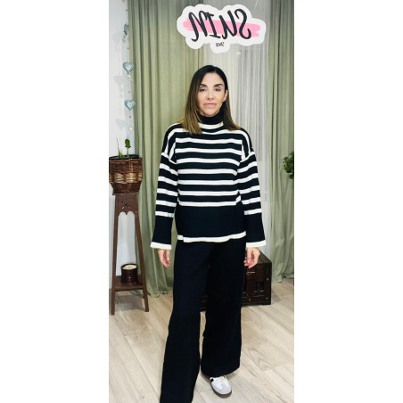 Conjunto de punto de cuello alto, cintura elástica y pierna ancha.